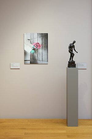 Katharina Schreiter (*1984 in Dresden) nutzt die Architektur des Museum der bildenden Künste Leipzig (MdbK) für fotografische Selbstinszenierungen. Im Fokus stehen die körperliche Erfahrung des Innenraums und seiner Materialien. Sie kombiniert Schwarzweißaufnahmen der Räume mit performativen Selbstporträts, die durch grellfarbige Requisiten hervorgehoben werden.